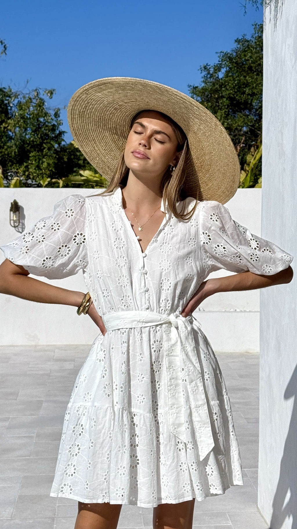 This elegant mini dress features a button-down front and an elasticated waistband for a tailored silhouette. It showcases tiered skirt detailing and puff sleeves with elasticated cuffs, crafted from delicate broderie anglaise cotton fabric. A detachable waist tie offers a refined finishing touch.